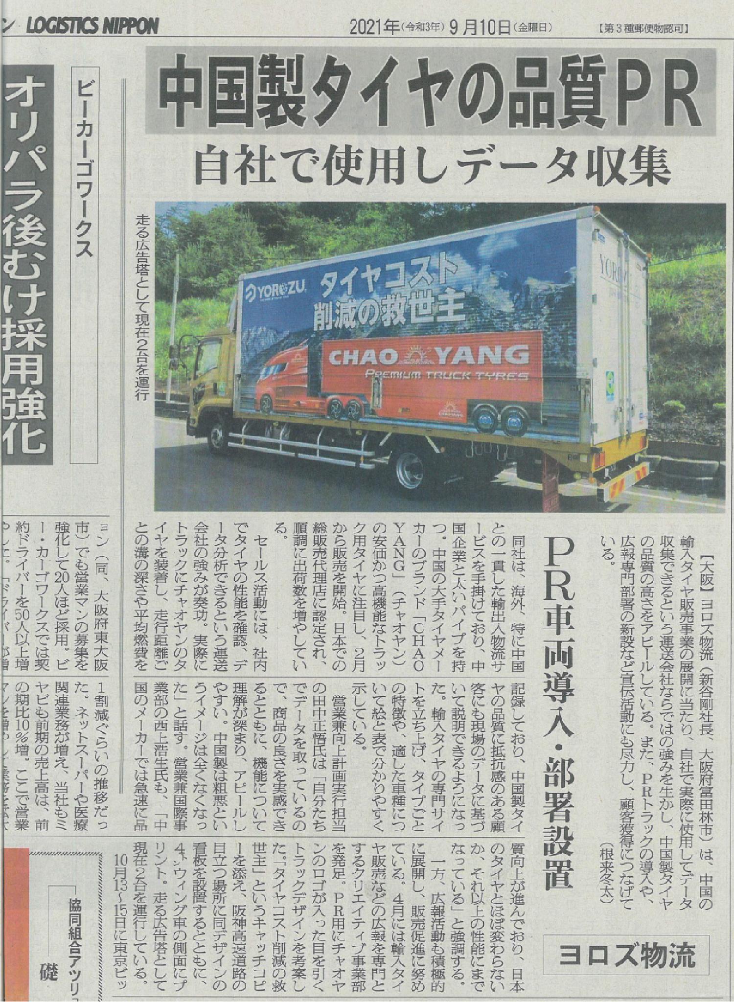 TOPコスト削減 CHAOYANG TIREZC RUBBER(中策ゴム)とは TRUCK TIRESトラックタイヤ一覧 AGENCY & SHOP代理店・販売店一覧 PURCHASEご購入・御見積り NEWS & MEDIA新着・掲載メディア 9月10日号 物流ニッポンに輸入トラック チャオヤンが掲載されました! 2021.09.14 一覧へ戻る