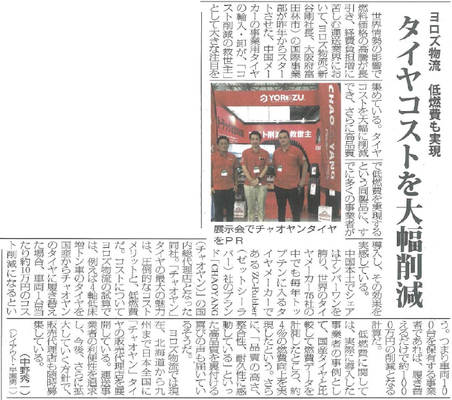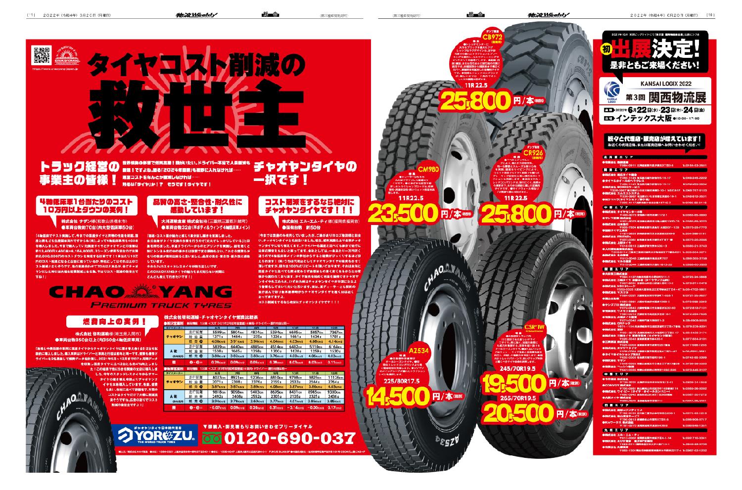TOPコスト削減 CHAOYANG TIREZC RUBBER(中策ゴム)とは TRUCK TIRESトラックタイヤ一覧 AGENCY & SHOP代理店・販売店一覧 PURCHASEご購入・御見積り NEWS & MEDIA新着・掲載メディア 物流ウィークリー2022年6月20日号に掲載されました。 2022.06.27 一覧へ戻る